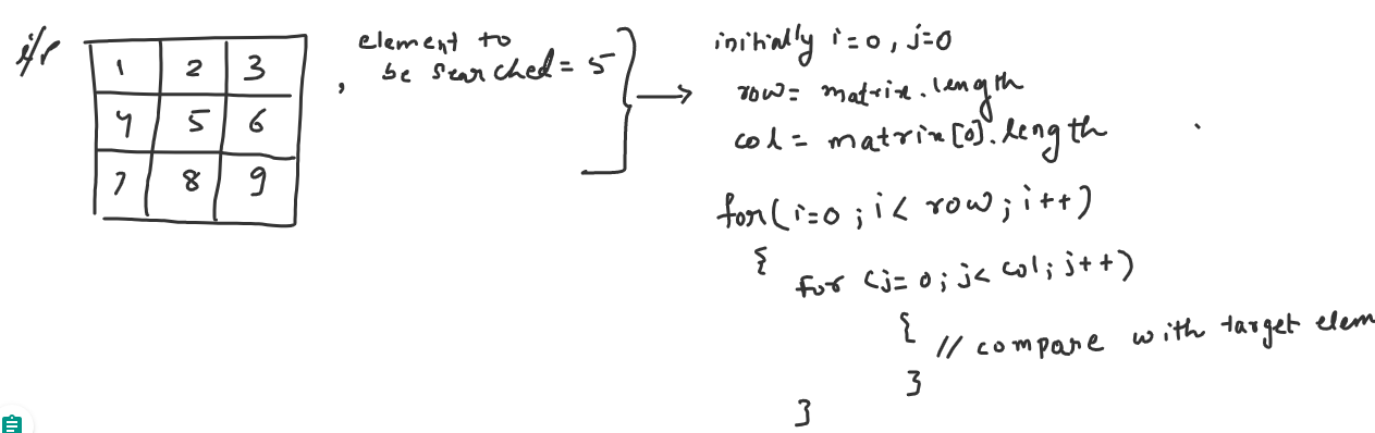For this approach, run two loops covering all the elements of rows and columns and compare whether the element to be searched is same as the current element of the iteration. If the search is successful, return true. If the iteration is completed, then return false. This depicts none of the elements in the array matched with the element to be searched.